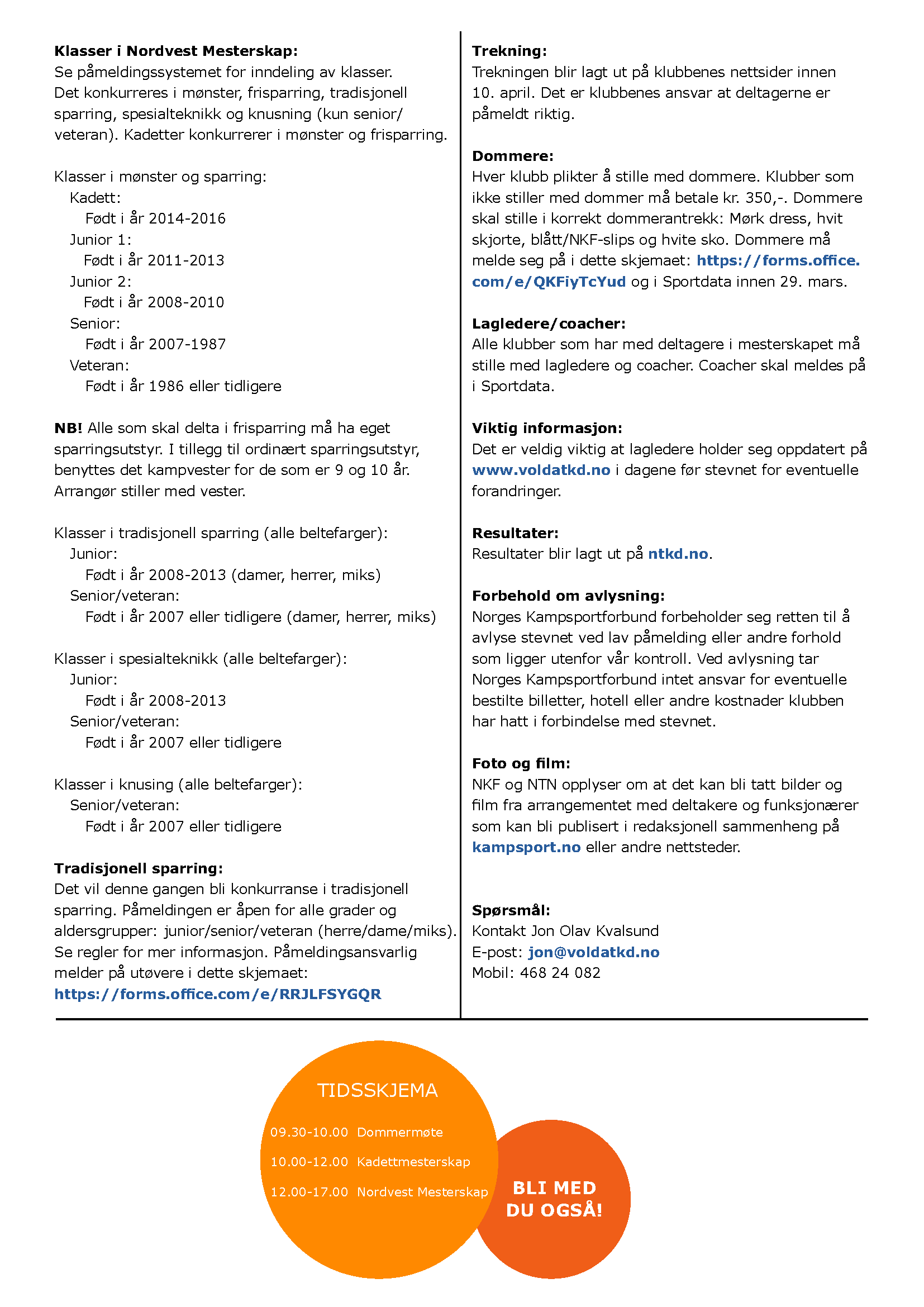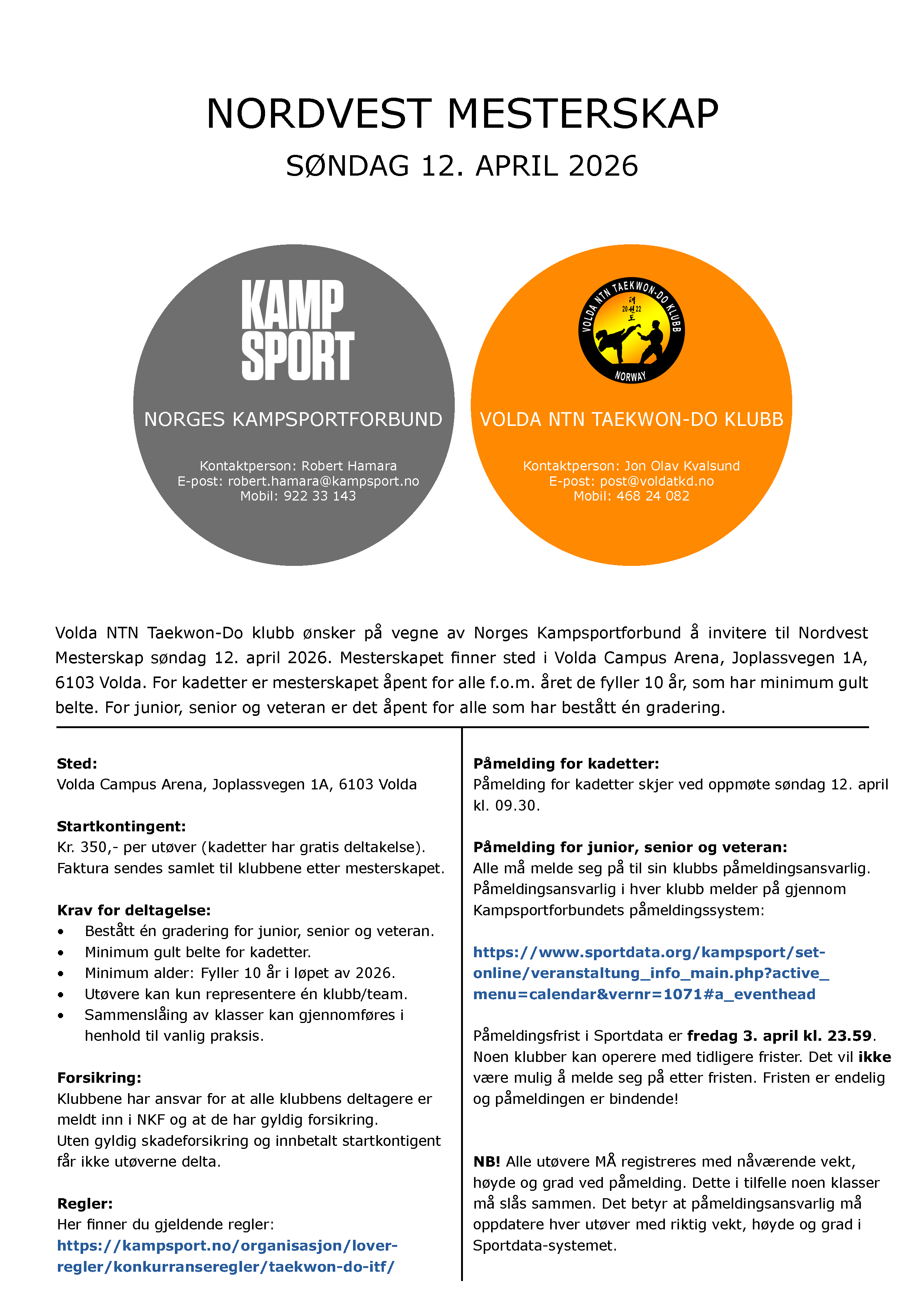 For alle utøvere fra Volda NTN Taekwon-Do klubb gjøres påmeldingen innen torsdag 2. april kl. 23.59: Nordvest - Påmelding for Volda